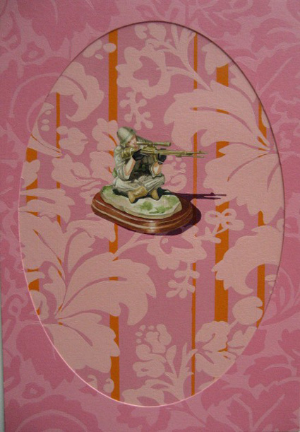 カラフルな文様をバックにフィギュアのような無機質な人物、動物を描くアーティスト。